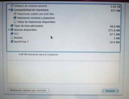 Aqui es donde puedes tener mas confusión, yo te recomendaría que deselecciones todo lo que te deje deseleccionar de compatibilidad de impresoras , los idiomas disponibles también deseleccionala si no usas mas que el español, el x11 no creo que lo uses tampoco, Rosetta yo no suelo instalarlo, intento usar aplicaciones intel, pero si alguna aplicación que uses en el futuro hace uso de esta, Rosetta se te instalara automaticamente en ese momento, quicktime 7 también lo deseleccionaria en tu caso, si solo lo usas para música, con el Quicktime X te sobra.